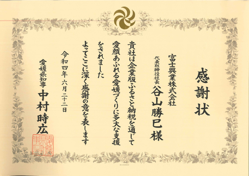 愛媛県より企業版ふるさと納税に対する感謝状を受領しました。