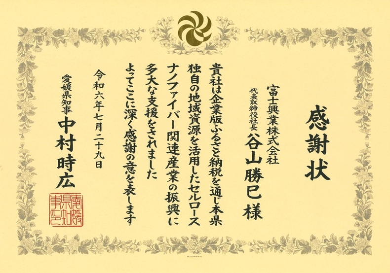 愛媛県より企業版ふるさと納税に対する感謝状を受領しました。